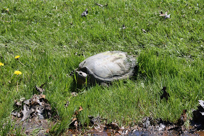 So when I went to see what had her hackles up this time, I was surprised to see a GIANT turtle scurrying across our yard from the road. Now, mind you, the road is a bit away from our front porch and I could make this thing out perfectly and it was BIG. So, of course, as any good mother would do, I grabbed my camera and my 5-year-old to go investigate.